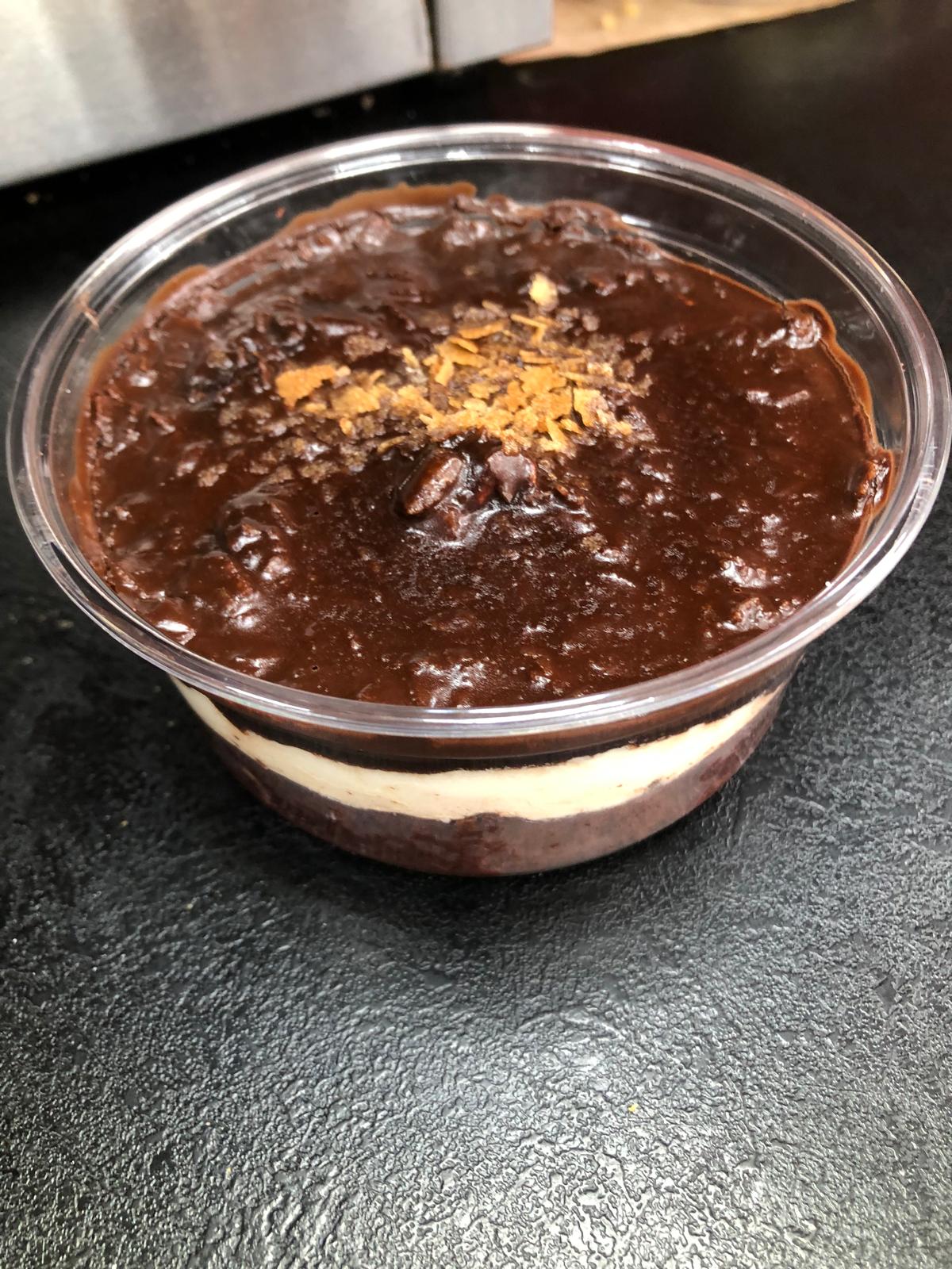 Chocolate Cake Layer, Chocolate Mousse Layer, Chocolate Ganache Layer followed by a Belgian Chocolate Shell and topped with a Cocoa Powder Layer.